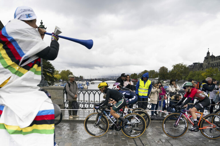 Cyklistky a diváci počas súťaže žien na Majstrovstvách sveta v cyklistike vo Švajčiarsku. Zürich, 28. september 2024. Foto: Til Buergy/Keystone via AP