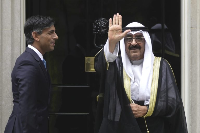Britský premiér Rishi Sunak a kuvajtský korunný princ Džábir al-Ahmad as-Sabáh počas stretnutia na Downing Street 10 v Londýne. SITA/AP.
