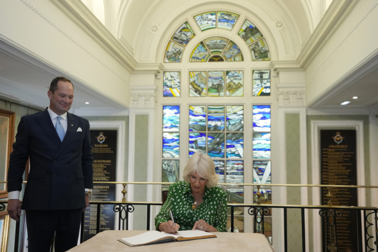 Britská kráľovná Kamila sa podpisuje do knihy návštev v londýnskom Royal Air Force Club. Foto: SITA/AP.