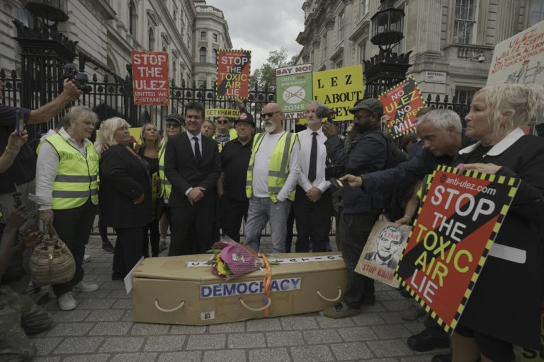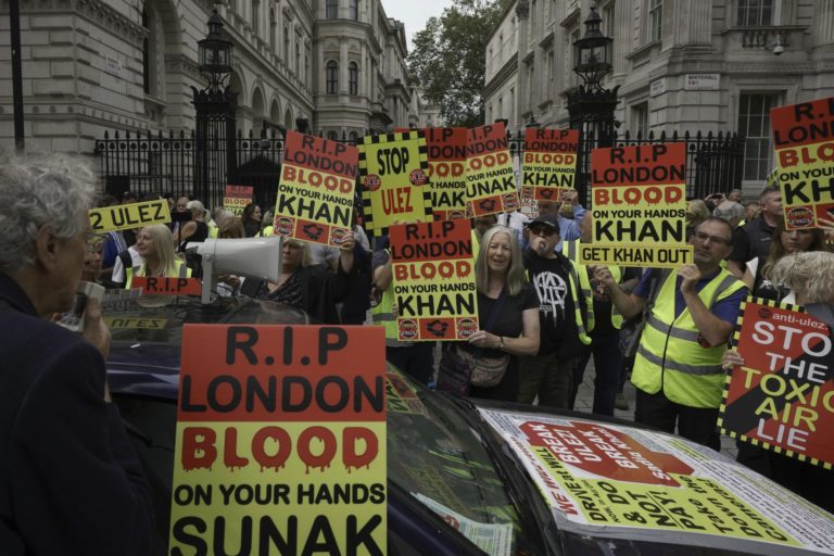 Protest v Londýne proti plánom starostu Sadiqa Khana rozšíriť nízkoemisné zóny v britskej metropole. Foto: SITA/AP.