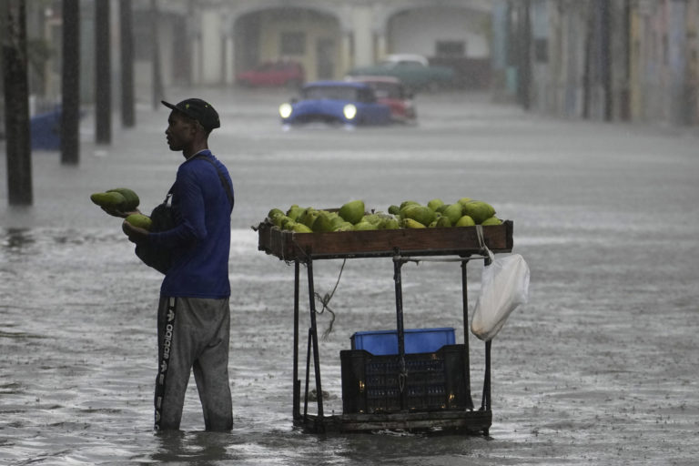 Predajca avokád na zatopenej ulici v Havane. Silné dažde priniesol hurikán Idalia. Foto: SITA/AP.