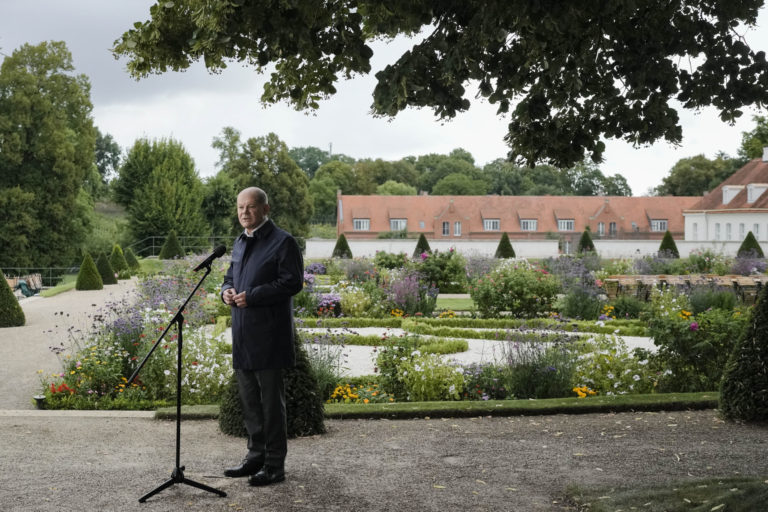 Nemecký kancelár Olaf Scholz pred rokovaním vlády v Mesebergu. Foto: SITA/AP.