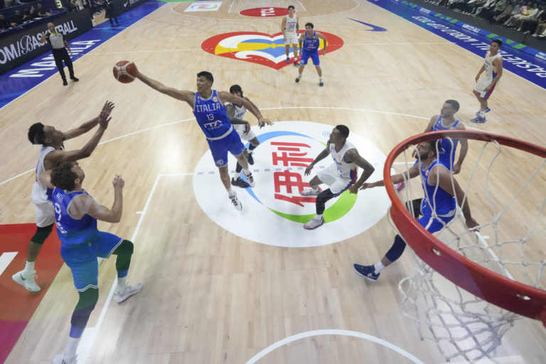 Taliansky reprezentant Simone Fontecchio (13) počas zápasu proti Filipínam na MS v basketbale mužov 2023. Foto: SITA/AP.