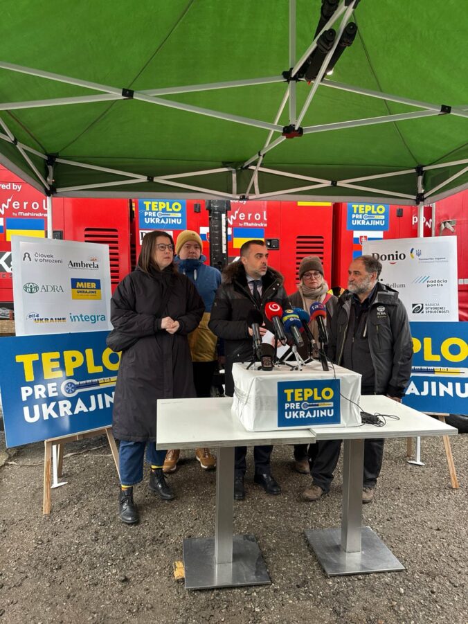 Veľvyslanec Ukrajiny v SR Myroslav Kastran (uprostred) počas vypravenia prvého kamióna s generátormi z Trenčína do ukrajinského mesta Černihiv, ktoré Slováci financovali prostredníctvom zbierky Teplo pre Ukrajinu. Generátory pomôžu zabezpečiť dodávky elektriny pre civilné obyvateľstvo a kľúčovú infraštruktúru. Pomoc zo získaných prostriedkov bude pokračovať aj v ďalších mestách Trenčín, 29. január 2026. Foto: SITA/Mier Ukrajine Foto: SITA/Mier Ukrajine