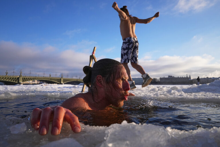 Člen klubu „Mrože rieky Neva“ sa kúpe v ľadovej vode rieky Neva v Petrohrade pri teplote vzduchu -15 stupňov Celzia. Rusko, 29. januára 2026. Foto: AP Photo/Dmitri Lovetsky