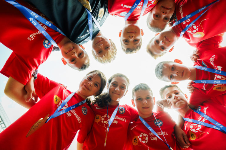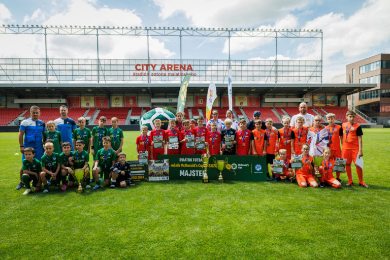 Hráči ZŠ s MŠ Hurbanova z Martina (vľavo) a hráči ZŠ Brezová z Piešťan (vpravo) na spoločnej fotografii po finálovom zápase 25. ročníka futbalového McDonald´s Cupu medzi ZŠ s MŠ Hurbanova z Martina a ZŠ Brezová z Piešťan, ktorý sa uskutočnil v Trnave. Trnava, 29. máj 2024. Foto: SITA/Peter Frolo/McDonald’s Cup