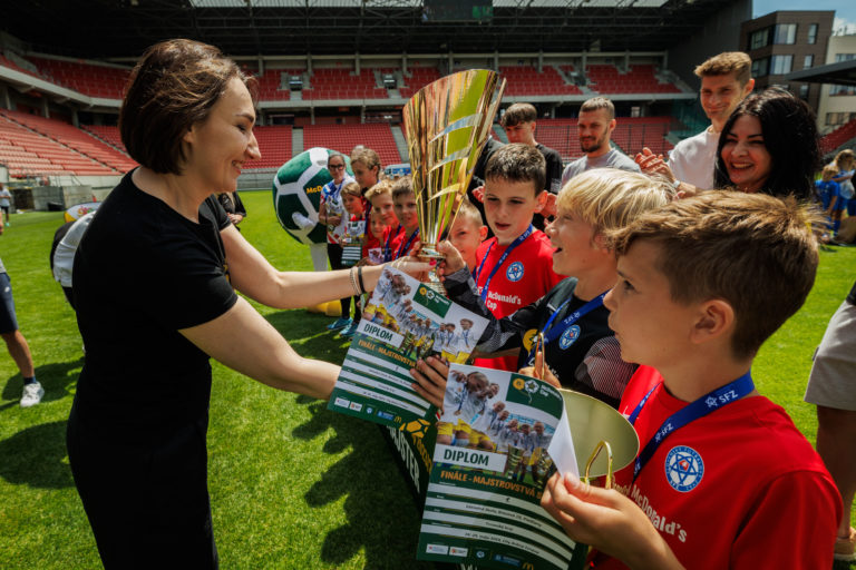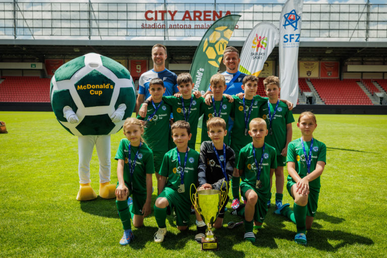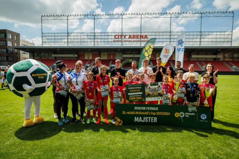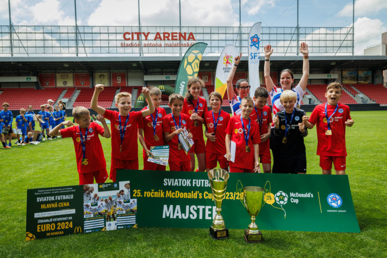 Hráči ZŠ Brezová z Piešťan si preberajú pohár víťaza po finálovom zápase 25. ročníka futbalového McDonald´s Cupu medzi ZŠ s MŠ Hurbanova z Martina a ZŠ Brezová z Piešťan, ktorý sa uskutočnil v Trnave. Trnava, 29. máj 2024. Foto: SITA/Peter Frolo/McDonald’s Cup