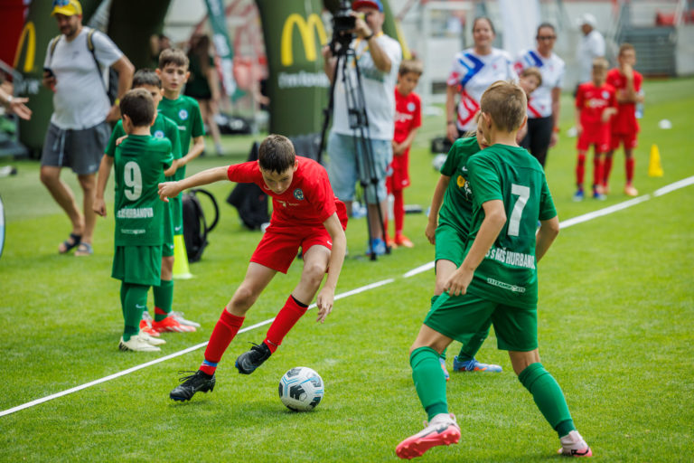 Hráči ZŠ s MŠ Hurbanova z Martina a ZŠ Brezová z Piešťan počas finálového zápasu 25. ročníka futbalového McDonald´s Cupu v Trnave. Trnava, 29. máj 2024. Foto: archívne, SITA/Peter Frolo/McDonald’s Cup