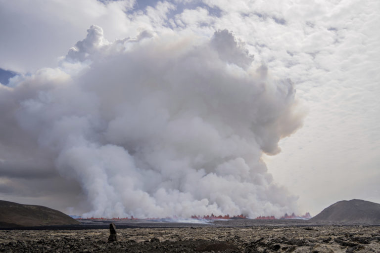A cloud of smoke billows as a volcano erupts in Grindavik, Iceland, Wednesday, May 29, 2024. A volcano in southwestern Iceland is erupting, spewing red streams of lava in its latest display of nature's power. A series of earthquakes before the eruption Wednesday triggered the evacuation of the popular Blue Lagoon geothermal spa. The eruption began in the early afternoon north of Grindavik, a coastal town of 3,800 people that was also evacuated. (AP Photo/Marco di Marco)