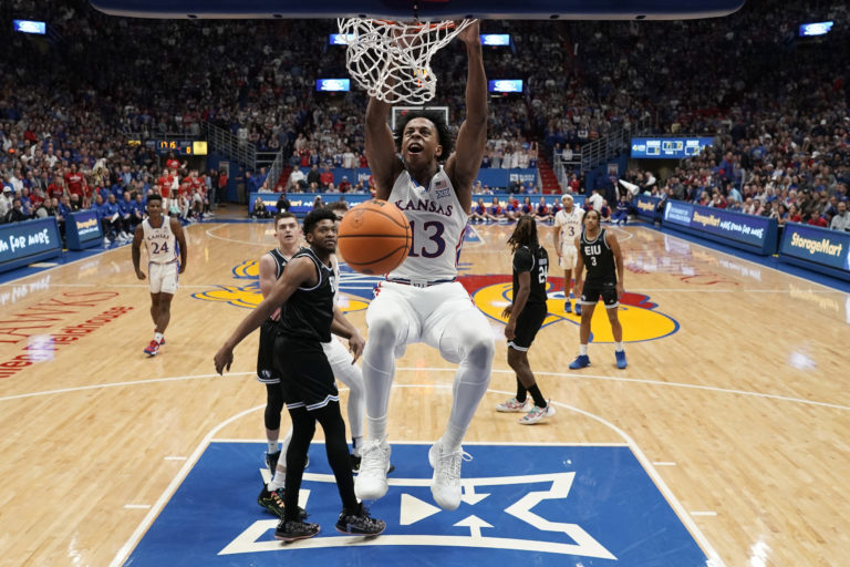 Basketbalista Kansasu Elmarko Jackson (13) hádže kôš počas prvého polčasu vysokoškolského basketbalového zápasu NCAA proti Eastern Illinois. Foto: SITA/AP.