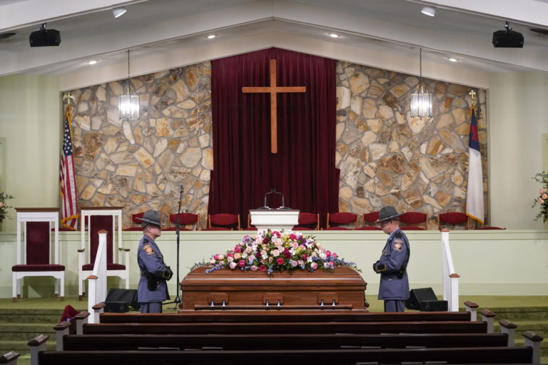 Čestná stráž zo štátnej hliadky štátu Georgia stojí pri rakve pred pohrebom bývalej americkej prvej dámy Rosalynn Carterovej v Baptistickom kostole Maranatha v Plainse. Foto: SITA/AP.