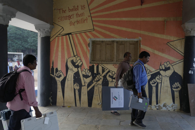 Úradníci majú pri sebe elektronické hlasovacie zariadenia a iný volebný materiál, aby ho zaniesli do volebných miestností v Hyderabade v Indii. Foto: SITA/AP.
