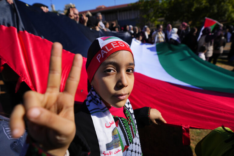 Dieťa ukazuje znak víťazstva počas zhromaždenia, na ktorom chcú vyjadriť podporu palestínskemu ľudu. Foto: SITA/AP.