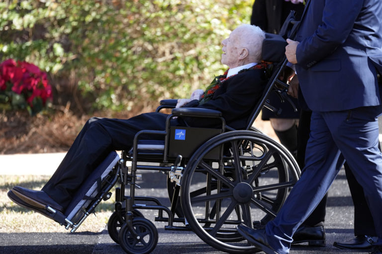 Bývalý americký prezident Jimmy Carter odchádza po pohrebe svojej manželky, bývalej prvej dámy Rosalynn Carterovej, v Baptistickom kostole Maranatha v Plainse. Foto: SITA/AP.