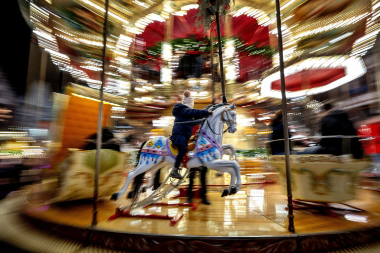 Dieťa jazdí na kolotoči na vianočnom trhu, ktorý bol otvorený v nemeckom Frankfurte v pondelok 25. novembra 2024. Foto: SITA/AP
