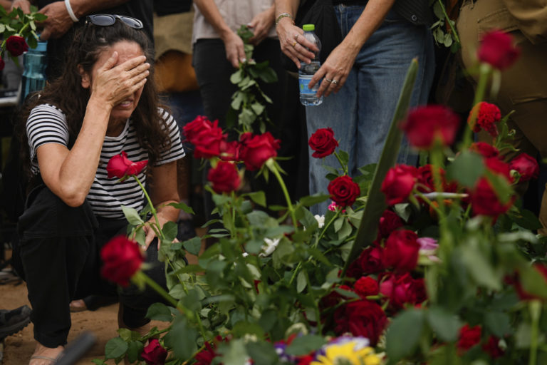Priatelia a príbuzní plačú pri hrobe zosnulej, ktorá bola zabitá militantmi Hamasu. Foto: SITA/AP