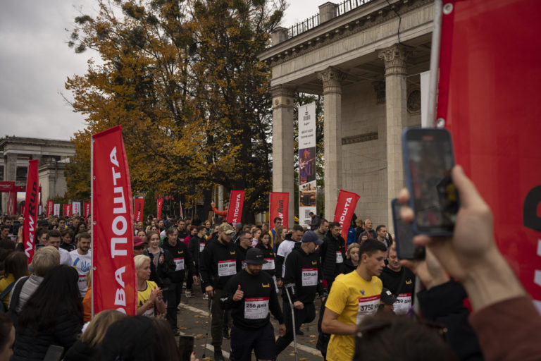 Ľudia sa zúčastnili na pretekoch na jeden kilometer v Kyjeve, cieľom je uctiť si armádu krajiny a získať finančné prostriedky na posilnenie ukrajinského systému protivzdušnej obrany. Foto: SITA/AP