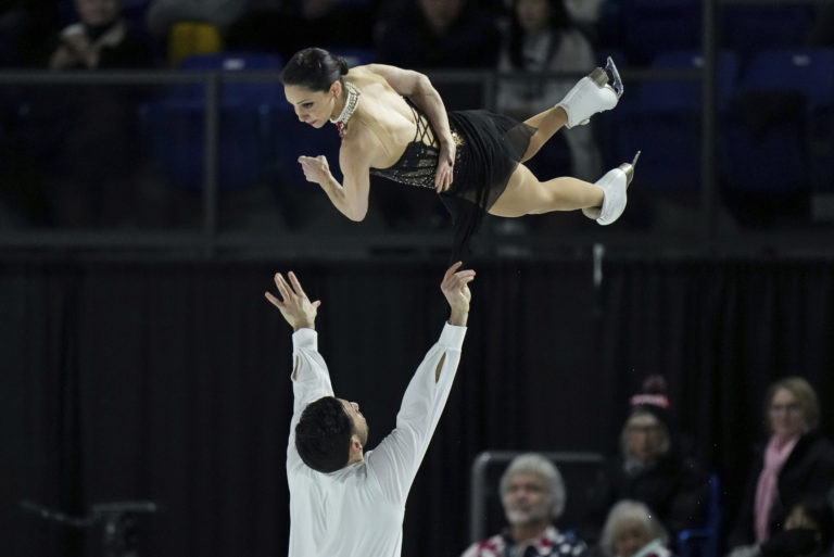 Kanaďania Deanna Stellato-Dudeková a Maxime Deschamps predvádzajú voľný program dvojíc počas krasokorčuliarskych pretekov Skate Canada International vo Vancouveri. Foto: Darryl Dyck/The Canadian Press via AP