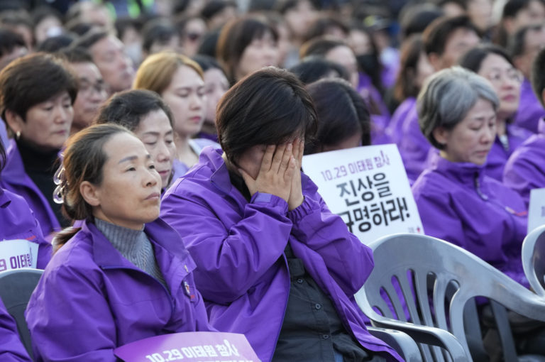 Príslušník obete plače počas zhromaždenia pri príležitosti prvého výročia otrasného náporu davu, ktorý zabil približne 160 ľudí v uličke Soulu. Foto: SITA/AP