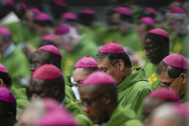 Biskupi na omši, ktorej predsedá pápež František na záver 16. generálneho zhromaždenia biskupskej synody v Bazilike svätého Petra. Foto: SITA/AP