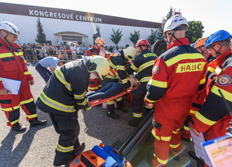 Prezentácia Hasičského a záchranného zboru SR, ktorý na pôde nitrianskeho výstaviska organizuje Majstrovstvá Slovenskej republiky vo vyslobodzovaní zranených osôb z havarovaných vozidiel počas výstavy Autosalón Autoshow Nitra na výstavisku Agrokomplex v Nitre. Nitra, 28. september 2023. Foto: SITA/Martin Havran