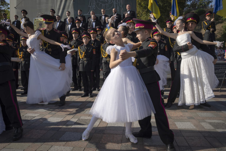 Mladí kadeti a školáčky v bielych šatách tancujú pri príležitosti slávnostnej prísahy pri pamätníku legendárneho princa Volodymyra, ktorý je jedným zo symbolov ukrajinského hlavného mesta Kyjeva. Foto: SITA/AP
