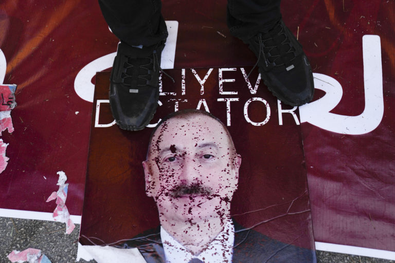 Libanonský Armén šliape na znehodnotený plagát zobrazujúci prezidenta Azerbajdžanu Ilhama Alijeva pred azerbajdžanským veľvyslanectvom v Bejrúte. Foto: SITA/AP