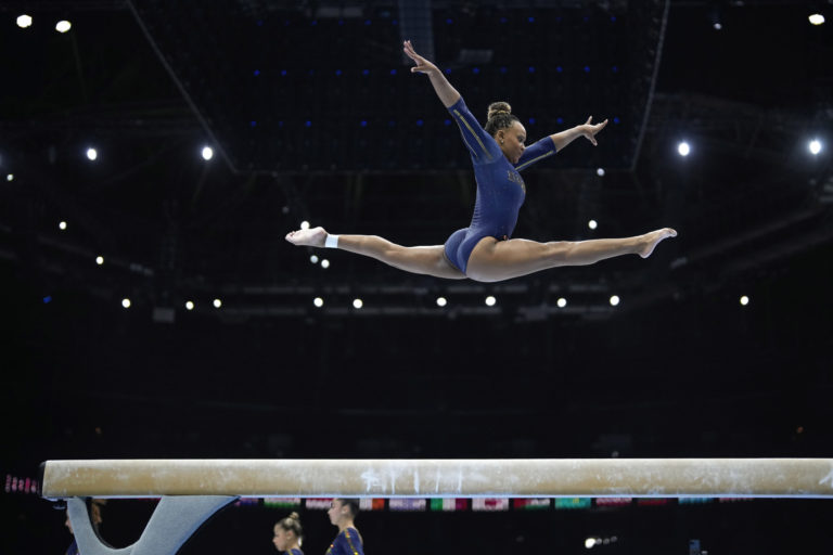 Brazílčanka Rebeca Andrade cvičí na kladine pred MS v umeleckej gymnastike v belgických Antverpách. Foto: SITA/AP
