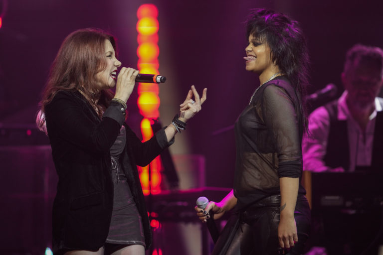 Lee Aaron a Fefe Dobson spievajú skladbu „Watcha Do to My Body“ počas podujatia Rock of Fame v Toronte. Foto: SITA/Andrew Lahodynskyj/The Canadian Press via AP