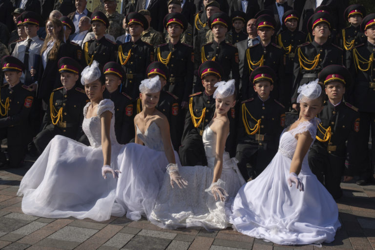 Mladí kadeti a školáčky v bielych šatách pózujú pri príležitosti slávnostnej prísahy pri pamätníku legendárneho princa Volodymyra, ktorý je jedným zo symbolov ukrajinského hlavného mesta Kyjeva. Foto: SITA/AP