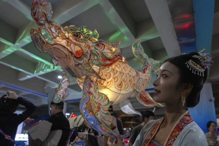 Žena s lampášom v tvare čínskeho draka počas Mid-Autumn Festivalu na 19. ročníku ázijských hier v Hangzhou v Číne. Foto: SITA/AP