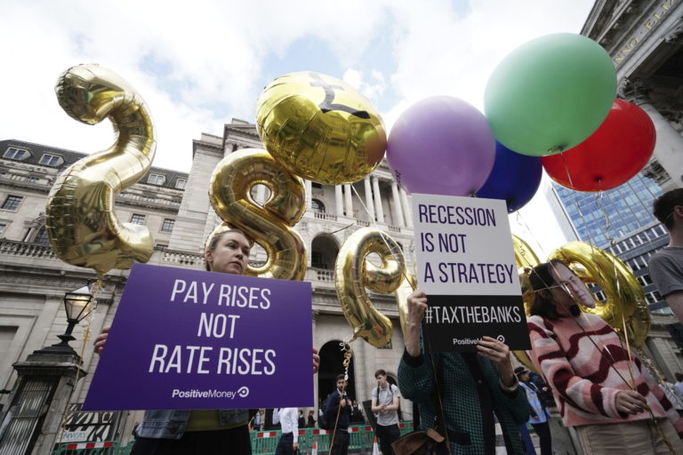 Aktivisti zo skupiny Positive Money protestujú pred Bank of England proti zvyšovaniu úrokových sadzieb v dôsledku krízy. Bank of England má v úmysle zvýšiť úrokové sadzby už po štrnásty raz za sebou na nové 15-ročné maximum a ponechať si otvorené dvere pre ďalšie zvýšenia, aby sa snažila zmierniť neustále vysokú infláciu (3. august 2023). Foto: (Jordan Pettitt/PA via AP.