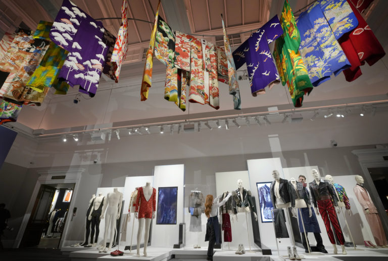 Pódiové kostýmy a kimoná Freddieho Mercuryho vystavené v aukčnej sieni Sotheby's v Londýne. Viac ako 1400 osobných predmetov Freddieho Mercuryho, vrátane jeho extravagantných scénických kostýmov, ručne písaných náčrtov skladby „Bohemian Rhapsody“ a malého krídlového klavíra, ktorý používal pri tvorbe najväčších hitov skupiny Queen, je vystavených na výstave pred ich predajom (3. august 2023). Foto: SITA/AP.