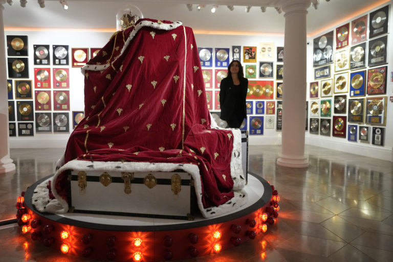 Plášť a koruna Freddieho Mercuryho, ktoré nosil počas Magic Tour vystavená v aukčnej sieni Sotheby's v Londýne. Viac ako 1400 osobných predmetov Freddieho Mercuryho, vrátane jeho extravagantných scénických kostýmov, ručne písaných náčrtov skladby „Bohemian Rhapsody“ a malého krídlového klavíra, ktorý používal pri tvorbe najväčších hitov skupiny Queen, je vystavených na výstave pred ich predajom (3. august 2023). Foto: SITA/AP.