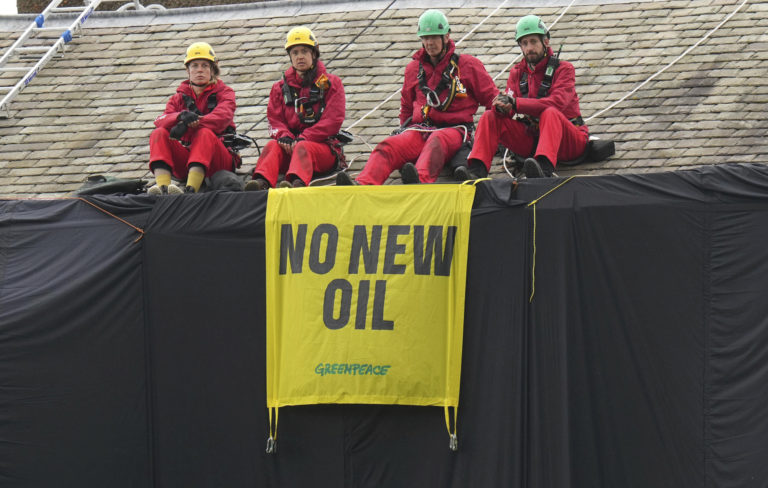 Aktivisti Greenpeace sedia na streche domu britského premiéra Rishiho Sunaka v Richmonde, ktorý na protest proti jeho plánu rozšíriť ťažbu ropy a plynu v Severnom mori "odeli" do čiernej farby (3. august 2023). Foto: Danny Lawson/PA via AP.
