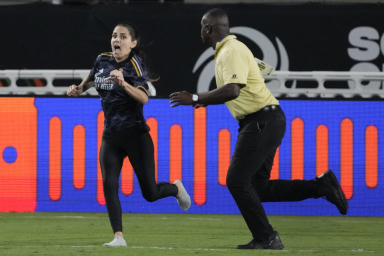 Fanúšička vbehla na trávnik počas zápasu Juventusu Turín proti Realu Madrid v snahe získať autogramy a selfie s hráčmi. Orlando, 3. august 2023). Foto: SITA/AP.