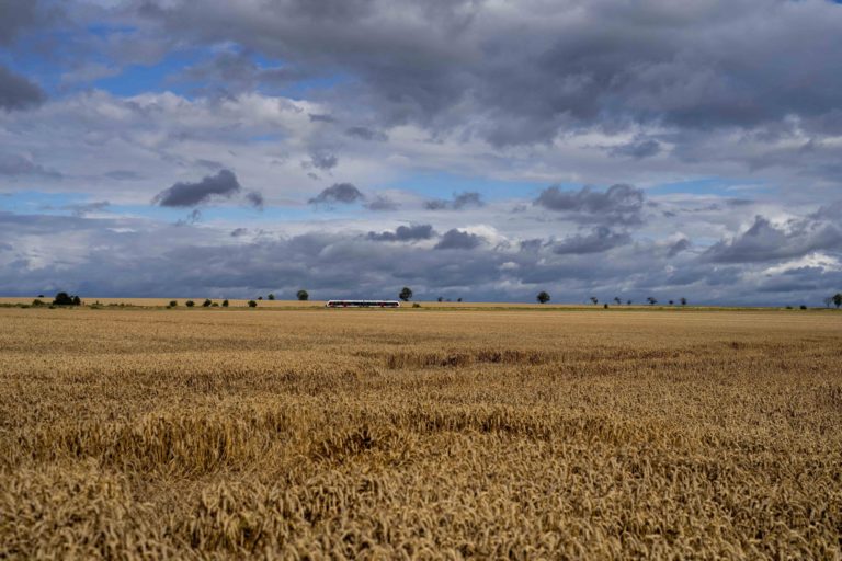 Vlak prechádza popri poli s obilím blízko mesta Wernigerode v Nemecku (3. august 2023). Foto: SITA/AP.