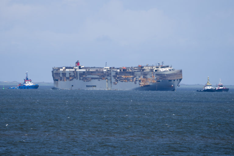 Poškodená nákladná loď Fremantle Highway, ktorú na ceste z Nemecka do Singapuru zachvátil požiar, už odťahujú do prístavu Eemshaven v Holandsku (3. august 2023). Foto: SITA/AP.