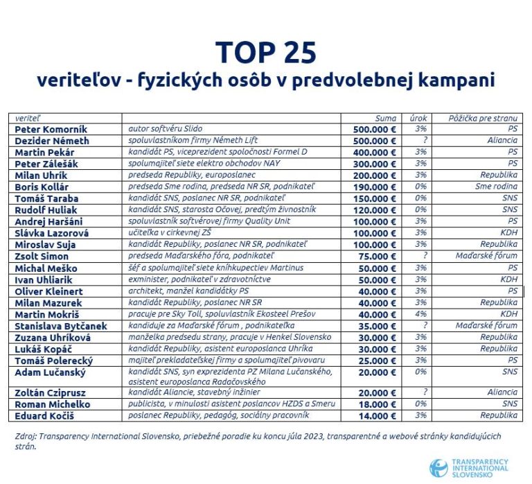 Tretinu predvolebnej kampane držia veľkí súkromní veritelia, zistila nezisková organizácia Transparency International Slovensko (TIS). Foto: www.facebook.com.