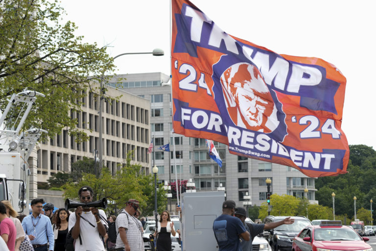 Podporovatelia Donalda Trumpa pred federálnym súdom vo Washingtone, kde sa vo štvrtok začína proces ohľadom snáh zvrátiť výsledky posledných prezidentských volieb. Washington, 3. august 2023. Foto: SITA/AP.