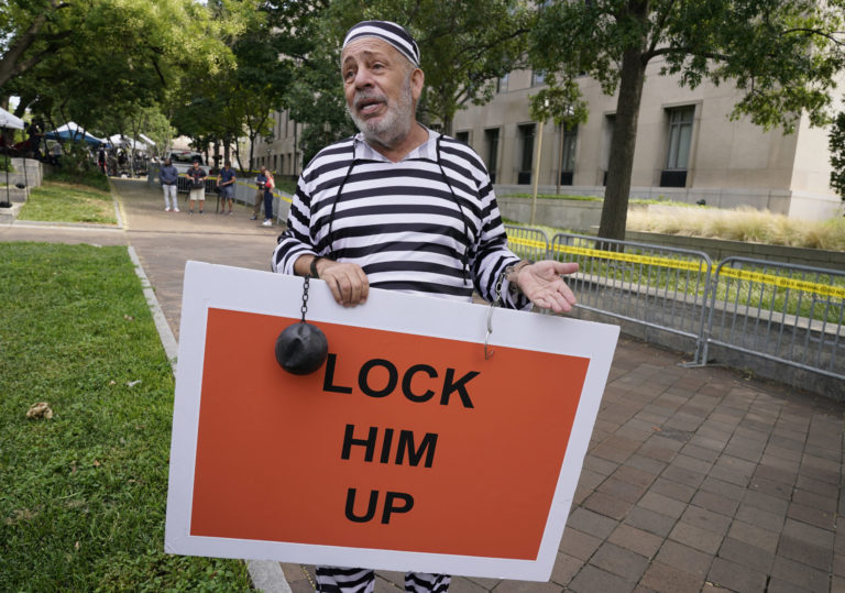 Šesťdesiatjedenročný Domenic Santana z Miami drží transparent, ktorým "radí" uväzniť exprezidenta Donalda Trumpa, ktorý sa vo štvrtok postavil pred federálny súd vo Washingtone, kde sa začal proces ohľadom snáh zvrátiť výsledky posledných prezidentských volieb. Washington, 3. august 2023. Foto: SITA/AP.