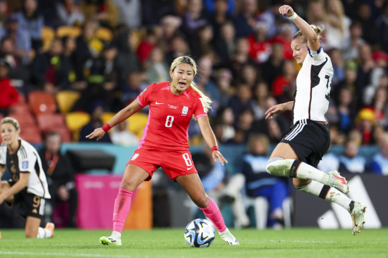 Juhokórejčanka Čcho So-hjun a nemecká reprezentantka Alexandra Poppová počas zápasu H-skupiny na MS vo futbale žien 2023, ktorý sa skončil nerozhodne 1:1. Tent výsledok znamená, že Nemky končia svoje účinkovanie na turnaji prekvapujúco už v základnej skupine. Brisbane, 3. august 2023. Foto: SITA/AP.