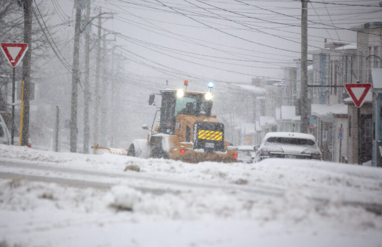 Pluh odhŕňa sneh v uliciach St. John's na Newfoundlande počas silného sneženia. Kanada, 3. decembra 2025. Foto: Paul Daly/The Canadian Press via AP