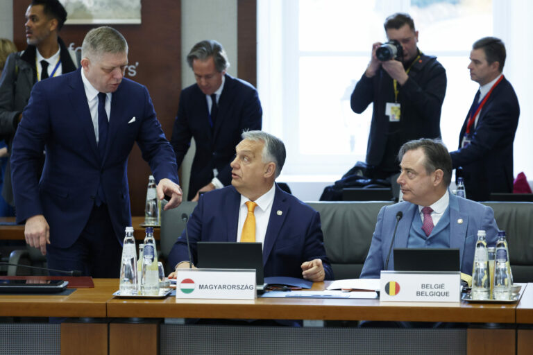Premiér Slovenskej republiky Robert Fico (zľava), maďarský premiér Viktor Orbán a belgický premiér Bart de Wever na samite v Bruseli. Foto: SITA/AP