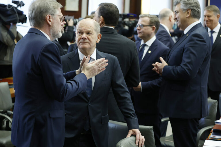 Český premiér Petr Fiala a nemecký kancelár Olaf Scholz na samite v Bruseli. Foto: SITA/AP