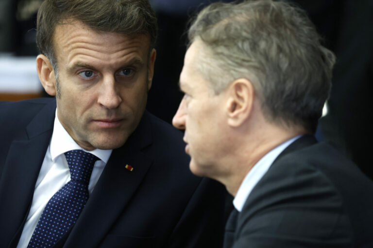 Francúzsky prezident Emmanuel Macron (vľavo) a slovinský premiér Robert Golob na samite v Bruseli. Foto: SITA/AP