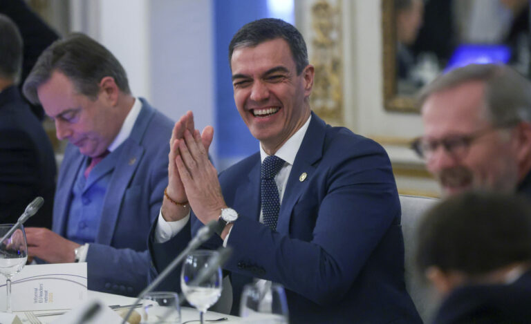 Belgický premiér Bart de Wever (zľava), španielsky premiér Pedro Sanchez a český premiér Petr Fiala na samite v Bruseli. Foto: SITA/AP