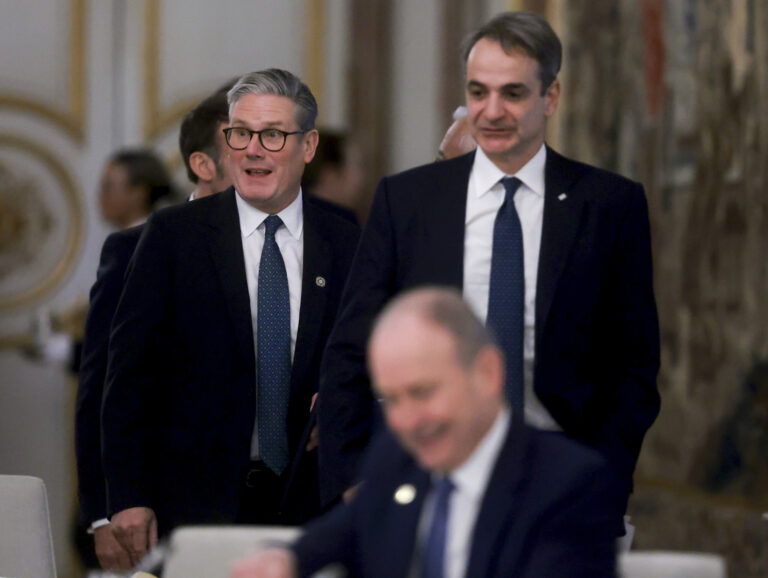 Britský premiér Keir Stammer (zľava) a grécky premiér Kyriakos Mitsotakis na samite v Bruseli. Foto: SITA/AP