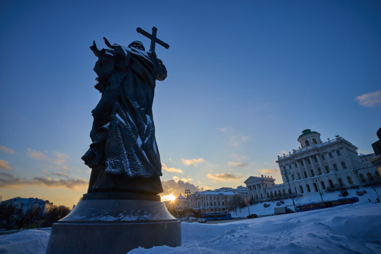 Socha kniežaťa Vladimíra (svätý Vladimír I. Veľký), ktorý pokrstil Kyjevskú Rus, otočená chrbtom ku kamere, stojí pri západe slnka pred Kremľom v Moskve. Rusko, 3. februára 2026. Foto: AP Photo/Alexander Zemlianichenko