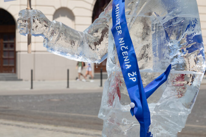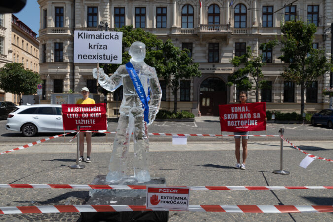 Greenpeace Slovensko priniesol pred ministerstvo životného prostredia ľadovú sochu, ktorú nechal v dnešnej, 37-stupňovej horúčave na mieste roztopiť. Socha v životnej veľkosti znázorňovala ministra Tomáša Tarabu, ktorý v ruke držal tabuľku s nápisom “Klimatická kríza neexistuje”. Ochrancovia prírody kritizujú ministra za to, že svojou nečinnosťou v oblasti ochrany klímy nechráni pred extrémnymi horúčavami tých najzraniteľnejších - starých ľudí a deti. Bratislava, 3. júl 2025. Foto: SITA/Greenpeace Ján Skaličan